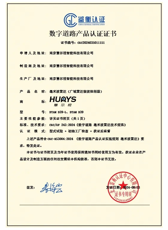 依据《CGC/GF 243:2024 数字门路 毫米波雷达技术规范》,VSportDTAM D39-L和DTAM D39两款毫米波雷达产物在“智能交通基础设施仿真与实证中心”通过了8大项、31小项的严格测试,获得鉴衡发表的首张数字门路领域毫米波雷达产物认证证书,证明了VSport自主研发的毫米波雷达满足数字门路应用场景要求,能够为自动驾驶技术提升和交通宁静治理提供数据支撑,为行业树立了新标杆。